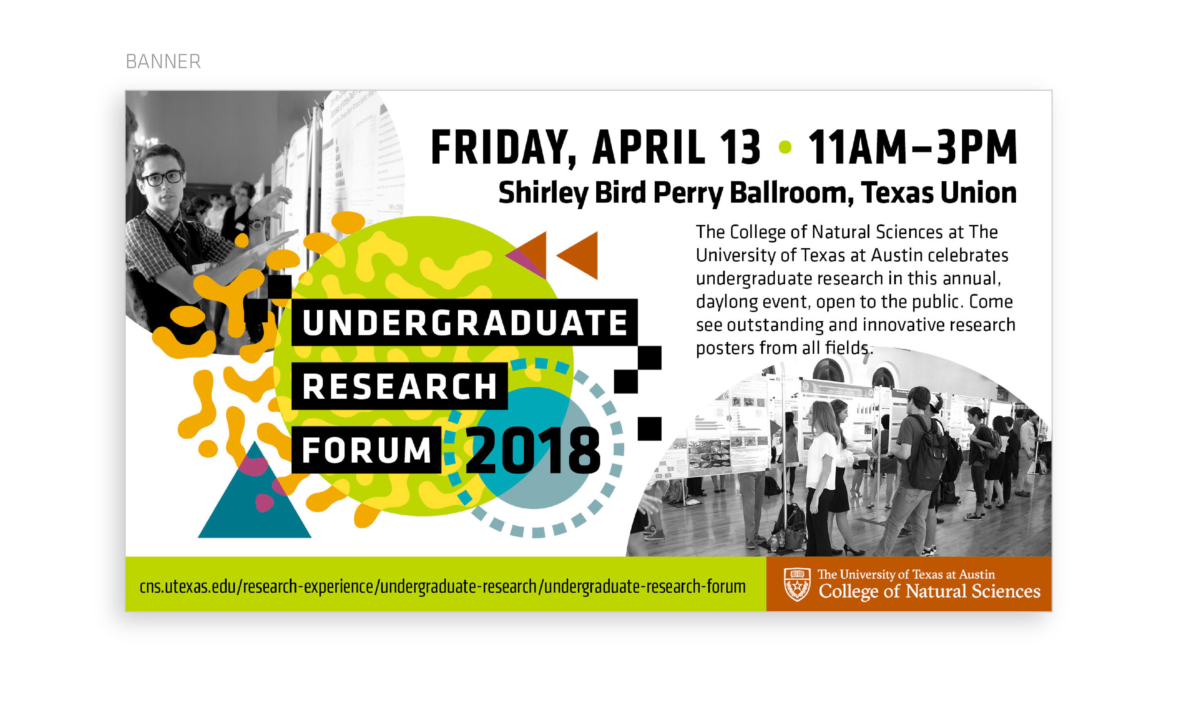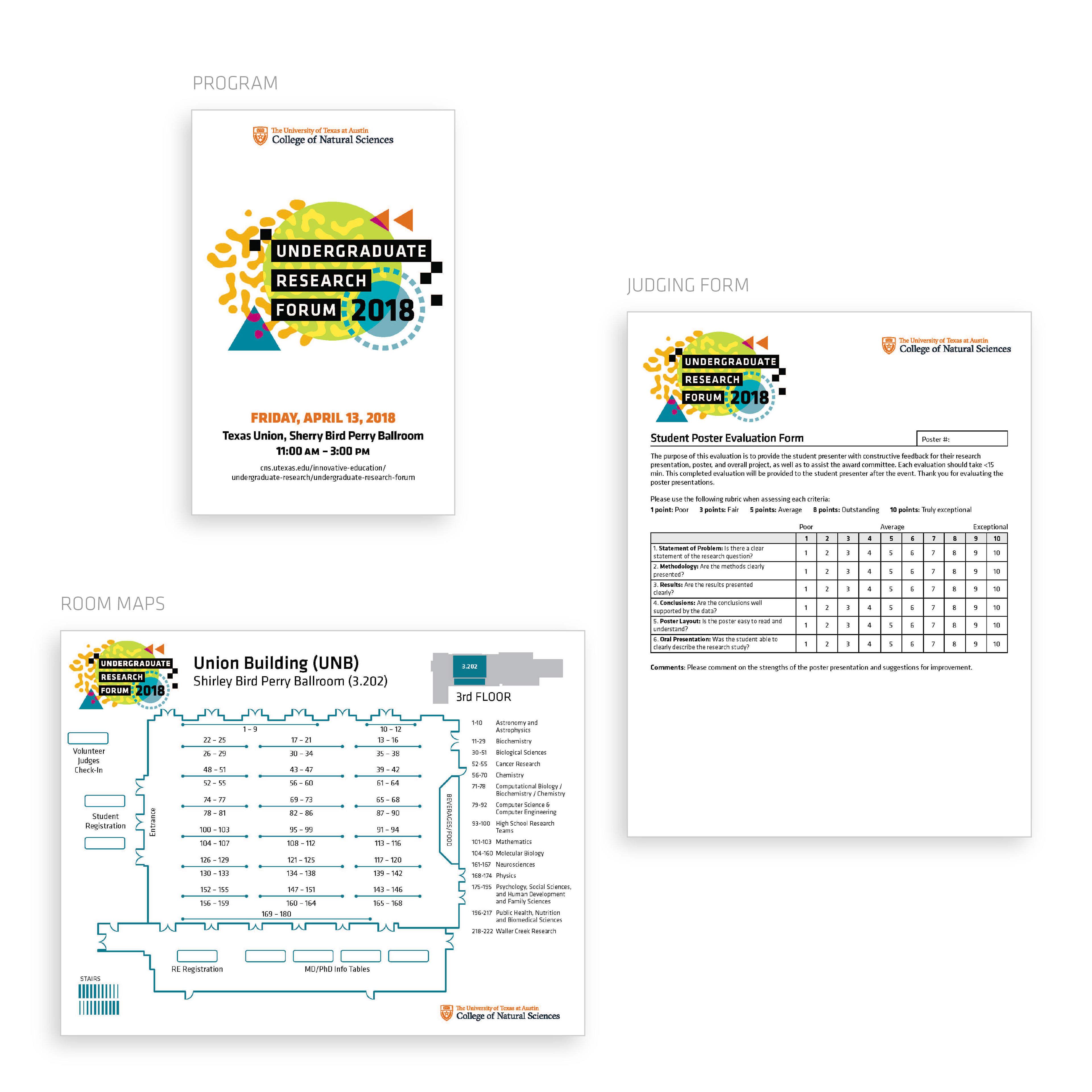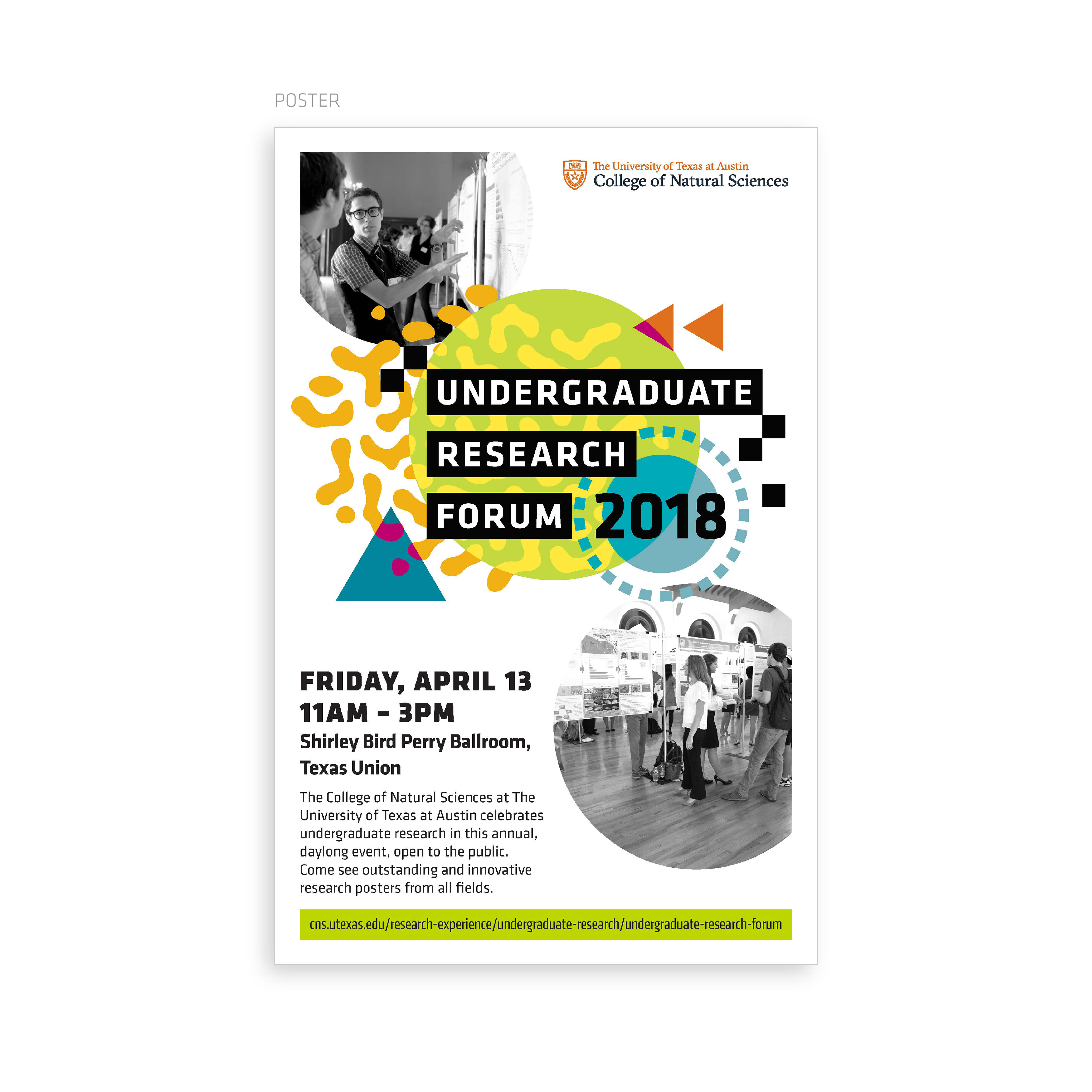 The Undergraduate Research Forum is an annual event where students share their research through poster presentations. I design and manage the production of all advertising, web assets, and day-of event materials such as maps and signage.